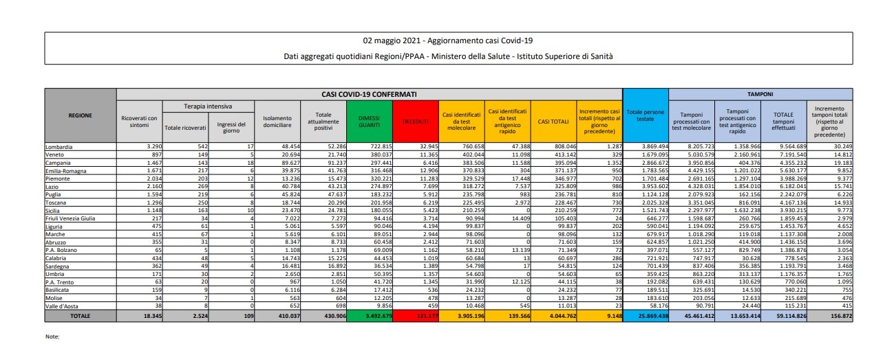 Covid Italia, il bollettino di oggi 2 maggio 2021 – Il Ministero della Salute, che quotidianamente aggiorna sui casi di positività al coronavirus in Italia, ha diffuso i dati di oggi. Sono 9.148 i nuovi positivi a fronte di 156.872 tamponi effettuati. La percentuale di positivi è del 5,83%, in aumento rispetto a ieri quando si attestava al 3,42%.