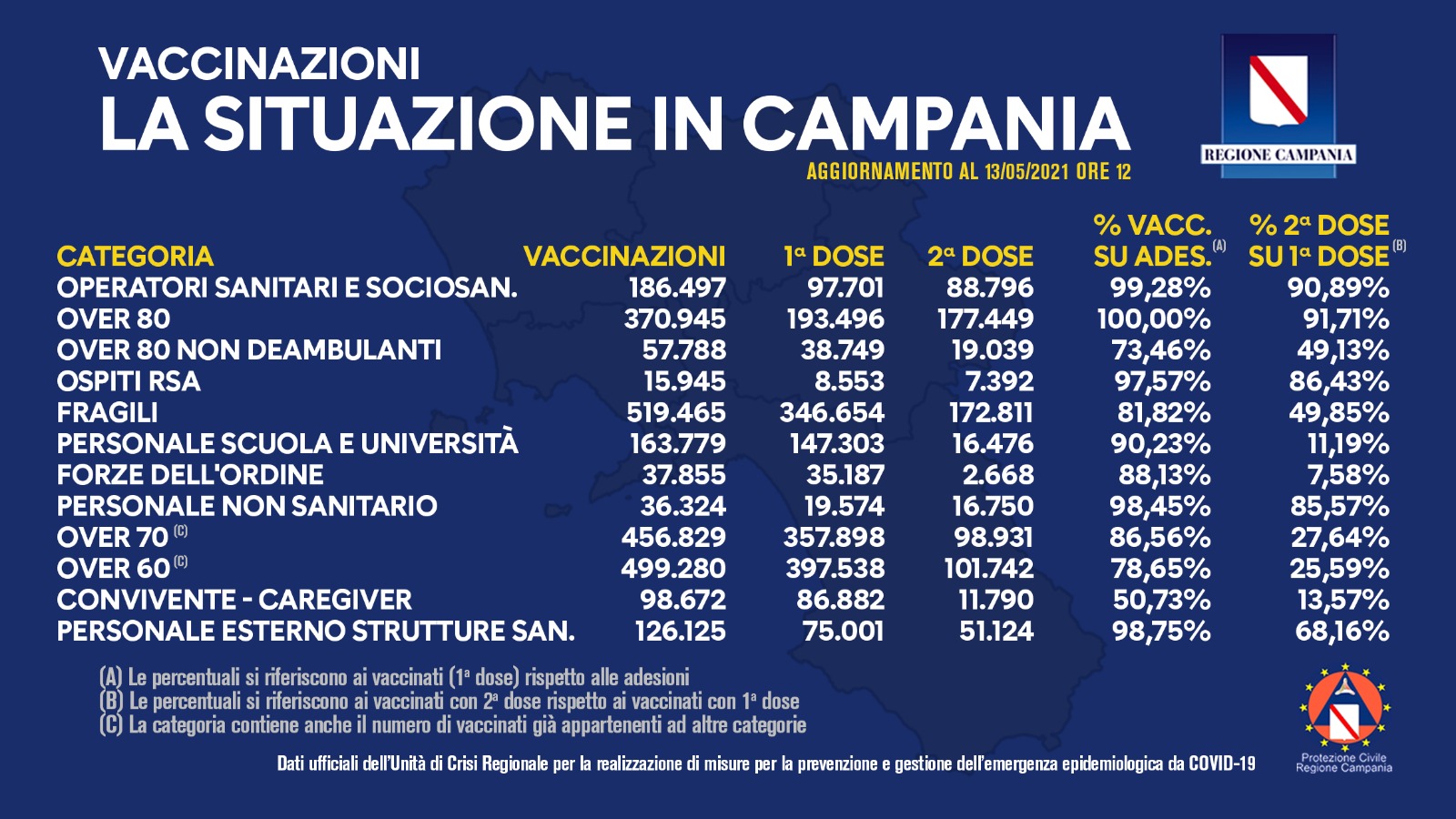 L’Unità di Crisi della Regione Campania, come di consueto, ha diffuso il bollettino delle vaccinazioni effettuate, aggiornato al 13 maggio 2021. Complessivamente sono stati vaccinati con la prima dose 1.656.993 cittadini (+35.301). Di questi 622.370 hanno ricevuto la seconda dose (+9.792). Le somministrazioni effettuate sono state, in totale, 2.279.363 (+45.093).