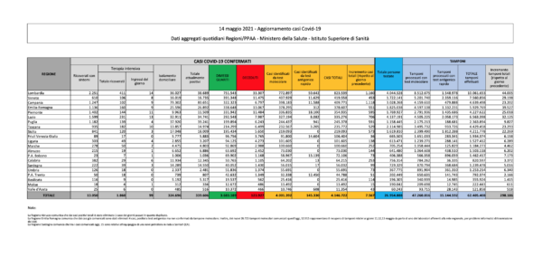 COVID ITALIA – IL BOLLETTINO DEL 14 MAGGIO