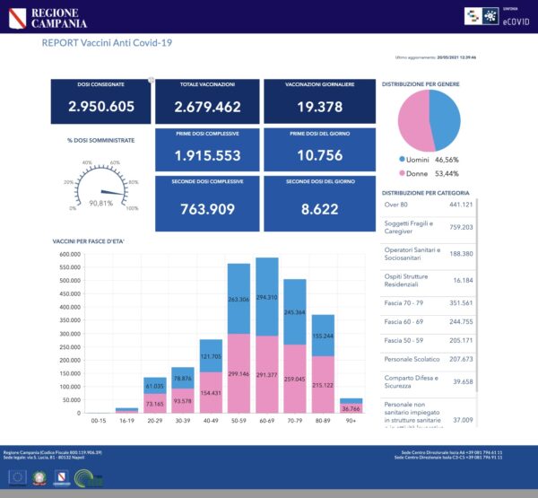 Come si vede anche dalla piattaforma, i dati di sintesi delle vaccinazioni in Campania aggiornati alle ore 12.30 del 20 maggio 2021 sono i seguenti: complessivamente sono stati vaccinati con la prima dose 1.915.553 cittadini (+37.965 rispetto a ieri). Di questi 763.909 (+20.478) hanno ricevuto la seconda dose. Le somministrazioni effettuate sono state, in totale, 2.679.462 (+58.713).