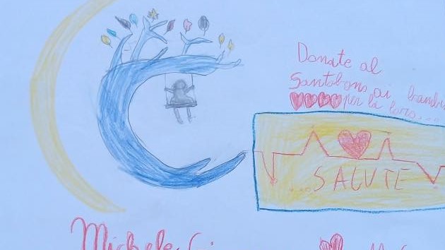 Il piccolo ha rappresentato un bambino che si dondola su di un’altalena, guardando l’orizzonte, affiancato da un monitor regolatore del battito cardiaco, con scritto in caratteri cubitali la parola ‘SALUTE’. Questo a voler rafforzare l’idea di speranza e pronta guarigione per i giovani pazienti.