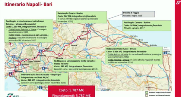 “Sono 5 anni che sto lavorando per questa tratta. E’ l’investimento più avanzato a livello nazionale, contiamo entro fine giugno, inizio luglio di consegnare le prestazioni degli ultimi due lotti. Entro fine anno, inizio del prossimo, avremo tutti i cantieri su tutti i lotti finanziati aperti e operativi. In tutto su questa tratta ci sono dieci lotti, inserisco dentro anche la stazione di Afragola, snodo fondamentale tra la Napoli-Bari e la linea Roma-Bari-Salerno-Reggio Calabria. L’occupazione prevista su tutti i lotti, tra diretti e indotto, sono tra i 5 mila e i 6 mila occupati. E’ un’opera avanzata, fiore all’occhiello dell’ingegneria italiana. Gli interventi non si fermano a Bari ma continuano fino a Foggia. Stiamo potenziando la prima infrastrutturale nazionale che costituisce l’ossatura portante di tutti quelli che interagiscono con la Napoli-Bari come la Potenza-Foggia. La Campania e la Puglia sono la dimostrazione che quando c’è la sintonia piena, tutto funziona“.