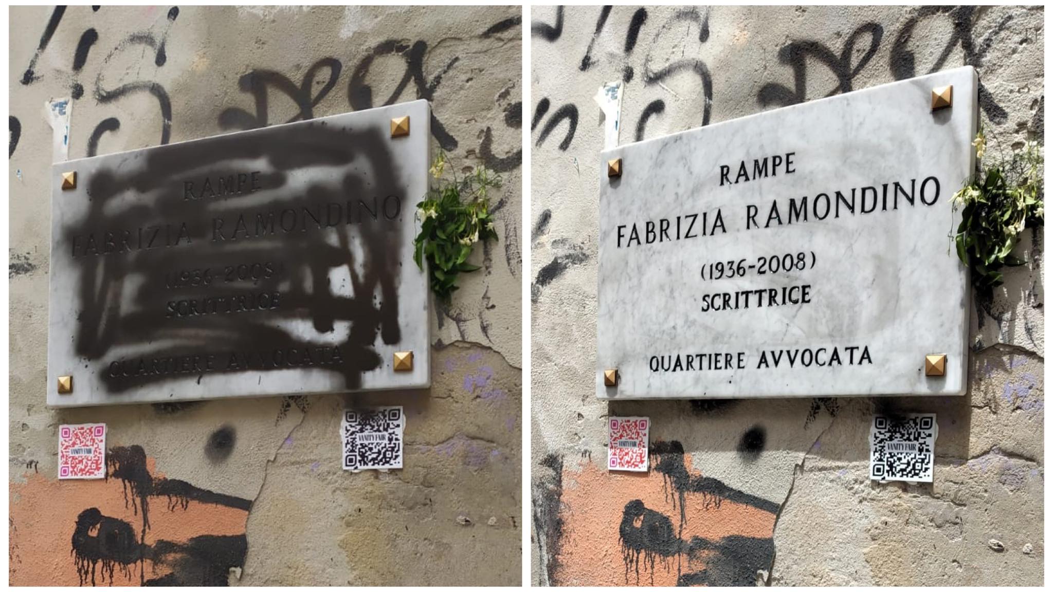 Dopo solo 24 ore dalla deposizione onoraria, però, è arrivata la triste notizia: la targa di Fabrizia Ramondino è stata vittima di un atto di vandalismo. La targa in marmo è stata ricoperte di vernice nera. Immediato è stato il rammarico e l’intervento delle istituzioni: “Stamani siamo stati avvisati che nella notte è stata vandalizzata la targa dedicata alla scrittrice Fabrizia Ramondino, affissa soltanto ieri sulle rampe di Salita Tarsia. Un evento a dir poco inspiegabile perché Fabrizia Ramondino rappresenta una figura assolutamente non divisiva, da qualunque punto di vista la si voglia vedere, e che anzi attraverso la sua arte è riuscita a unire tutte le anime della nostra città” afferma in una nota l’Assessore alla Toponomastica Alessandra Clemente.