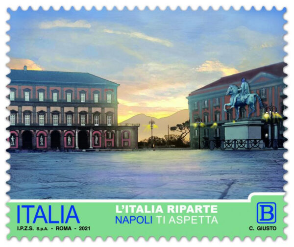 Il francobollo di Napoli ritrae, con la tecnica dell’acquarello, Piazza Plebiscito all’alba. Il bozzetto è stato realizzato da uno scatto di Velia Cammarano fotografa dell’Ufficio stampa del Comune di Napoli ed è stato stampato dal Poligrafico e Zecca dello Stato.