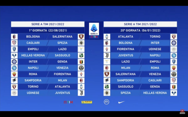 Ad esempio, se il Napoli dovesse incontrare la Salernitana alla prima giornata del girone d’andata, non la incontrerà alla prima giornata del girone di ritorno. Come sempre, le squadre che si sono incontrate alla prima o all’ultima giornata della scorsa stagione non potranno incontrarsi alla prima o all’ultima giornata di questa stagione.