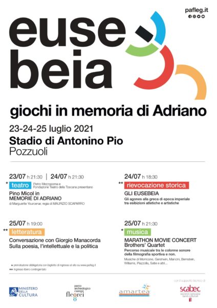 Il 23, il 24 e il 25 luglio 2021, tornano gli Eusebeia, antichi giochi istituiti dall’imperatore Antonino Pio nello stadio omonimo, in onore del suo predecessore Adriano e che si svolgevano con cadenza quinquennale. Uno sguardo al passato che questo fine settimana trasformerà il Parco Archeologico dei Campi Flegrei, facendolo diventare lo scenario per poter esporre di teatro, letteratura, musica, sport, con tanto di rievocazione storica grazie all’Associazione Amartea che ha organizzato l’evento insieme al Parco.