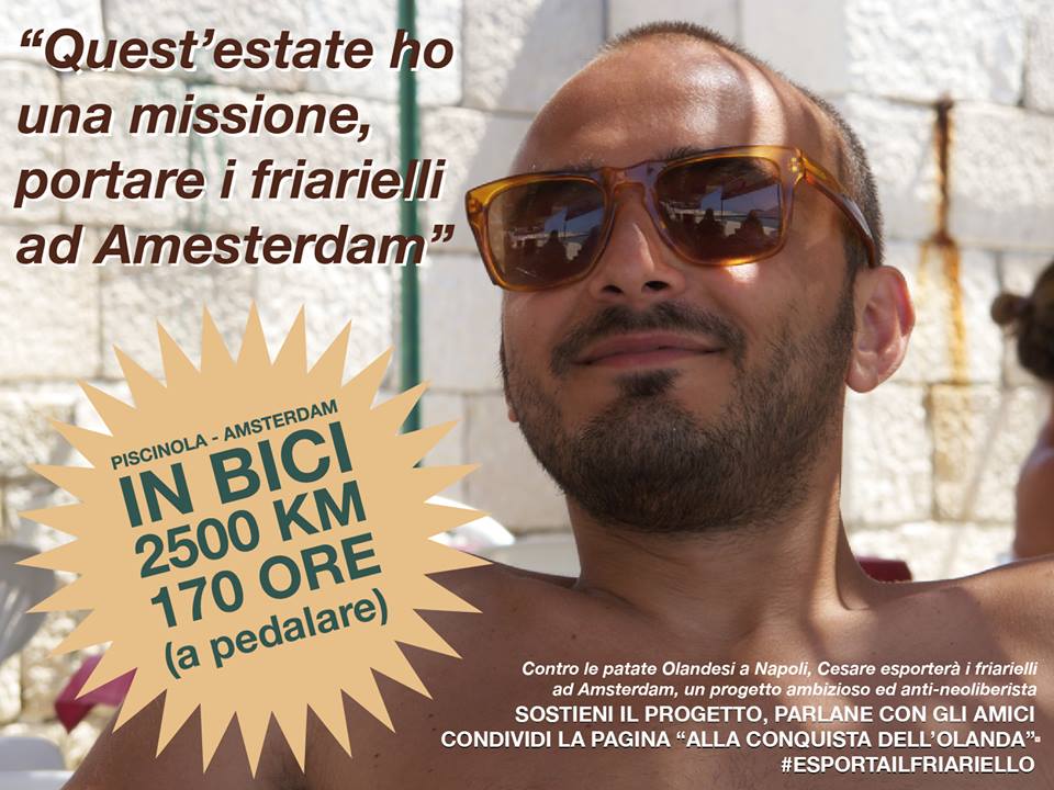Perché da questa città nascono idee geniali ed irresistibili, perché questa città partorisce gente folle e creativa come Casere Cascella, 30 anni, web designer, pronto a sfidare il capitalismo delle “patatinerie olandesi” esportando il friariello napoletano in Olanda. Fin qui non ci sarebbe nulla di particolare se non fosse che Cesare in Olanda ci va in bici. Un viaggio lungo 2.500 km grazie al quale il nostro grande friariello sarà il protagonista indiscusso di un tour all’insegna della napoletanità!