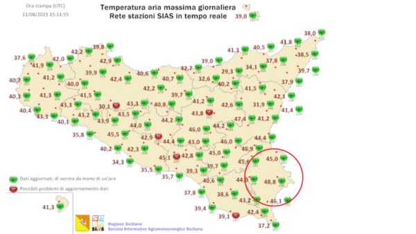 Il record per la temperatura più alta mai registrata in Europa da oggi appartiene a Siracusa. Alle 13:14:15 ora locale – informa il Sias, Servizio Informativo Agrometeorologico Siciliano – sono stati toccati i 48,8 °C presso la stazione SIAS di Siracusa C.da Monasteri, temperatura più elevata registrata dalla intera rete SIAS dalla sua installazione nel 2002. In quasi tutta la Sicilia, oggi, il termometro ha superato di molto i 40 gradi, specialmente nelle aree interne dell’isola colpite da un caldo insopportabile.