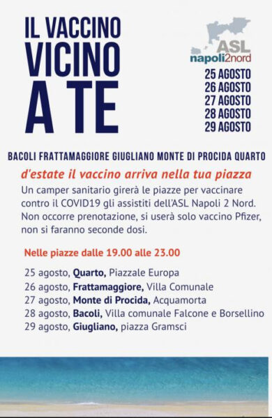 Dice Antonio d’Amore, Direttore Generale dell’ASL Napoli 2 Nord “La campagna vaccinale non va in vacanza. I dati sull’ospedalizzazione ci dicono chiaramente che il vaccino è l’unico farmaco capace di prevenire drasticamente su vasta scala le forme più gravi di sindrome da Covid19, intervenendo sia sui contagi che sulle ospedalizzazioni. Ad oggi circa 700.000 dei nostri cittadini si sono sottoposti a vaccinazione. È importante che le ultime migliaia di persone non ancora vaccinate seguano questa strada, per questa ragione abbiamo scelto di continuare i tour nelle piazze dei nostri Comuni. Ringrazio ancora i Sindaci per l’entusiastica e pronta disponibilità con cui ci hanno garantito il supporto”.