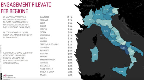 E’ la Campania la regina dell’estate 2021, la meta italiana preferita dai turisti. La conferma arriva da un particolare studio realizzato da Extreme che ha analizzato la presenza sui social (Instagram) per trasformare geolocalizzazioni e post in numeri reali. Il progetto si chiama ‘INSTAGRAMMABLE ITALY’ e vuole appunto analizzare i flussi turistici seguendo un segnale digitale.