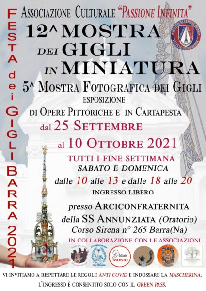 Questo il messaggio apparso sulla pagina della mostra: “Sabato prossimo alle ore 18,00 avrà inizio la 12° mostra dei Gigli in Miniatura presso la congrega della SS Annunziata (oratorio) al corso Sirena di fronte la chiesa di Sant’Anna. Purtroppo siamo ancora sottoposti a rispettare le regole anti-covid e quest’anno si aggiunge, come in tutte le mostre, l’obbligo di ingresso solo se muniti del Green Pass, il quale sarà verificato all’ingresso. Le norme vigenti chiedono questo, l’invito rivolto sia agli espositori sia ai visitatori è di presentarsi solo se si è in regola e muniti del certificato verde. Grazie a tutti per la collaborazione. Vi aspettiamo“.