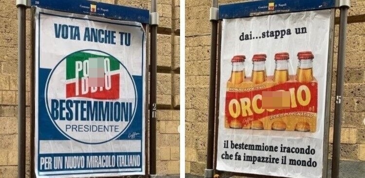 Nella città di Napoli sono apparsi alcuni manifesti che riportano vere e proprie bestemmie e imprecazioni associate a note pubblicità, slogan elettorali o immagini della Disney. Si tratta di un’iniziativa messa in campo per promuovere un festival delle arti per la libertà di espressione contro la censura religiosa, dal titolo ‘Ceci n’est pas un blasphème’, in programma fino al 30 settembre al Palazzo delle Arti di Napoli. A fare chiarezza sulla questione è intervenuta l’assessore alla cultura Annamaria Palmieri.