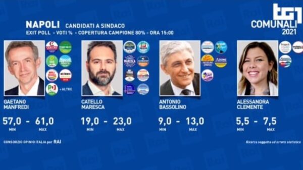 Secondo i primi exit poll, tuttavia, il candidato sindaco Manfredi avrebbe già sbaragliato la concorrenza, superando Catello Maresca, Antonio Bassolino e Alessandra Clemente, con oltre il 50%. Se tale tendenza dovesse essere confermata Manfredi andrebbe verso la vittoria al primo turno. In tal modo diventerebbe sindaco di Napoli senza dover affrontare il ballottaggio. Quanto ai votanti, i numeri finora registrati segnalano una scarsa affluenza dei cittadini alle urne, soprattutto nella giornata di ieri.