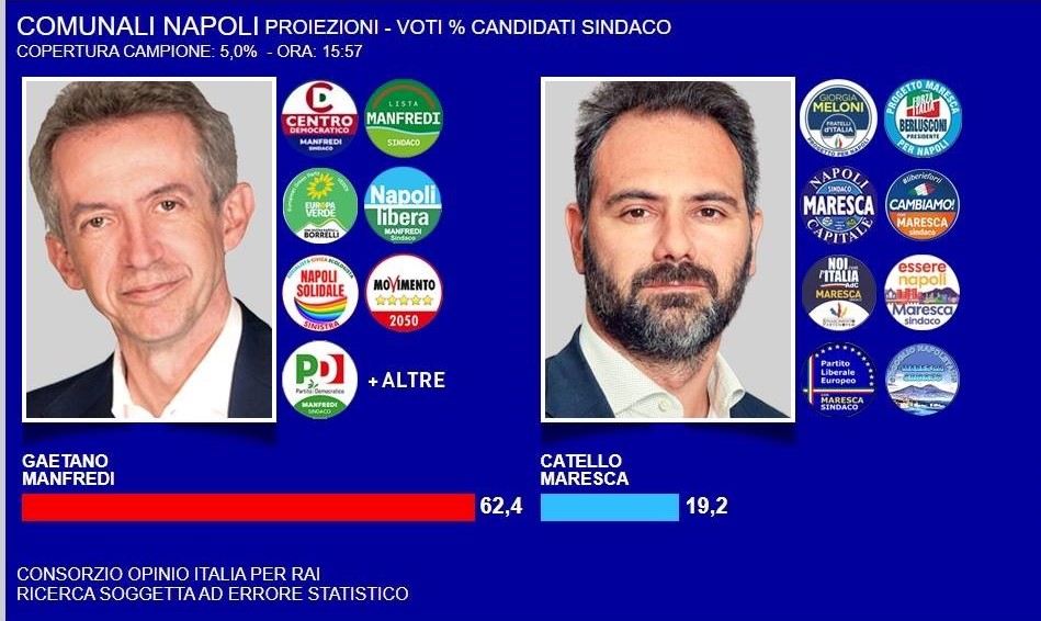I dati della seconda proiezione, aggiornata alle ore 17.09 (campione del 12%) vedono stabile Manfredi, mentre cresce Maresca a scapito di Bassolino.