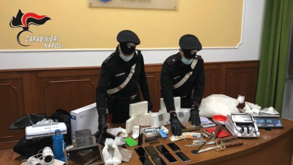 Durante l’intervento sono stati sottoposti a sequestro anche 13 chili di sostanza da taglio, un impianto di video sorveglianza con 7 telecamere perimetrali, diversi smartphones e 3 katane. Soltanto pochi giorni fa ancora i Carabinieri avevano bloccato e denunciato un 35enne di origine straniera in possesso di una katana che era a bordo di un treno della Circumvesuviana.