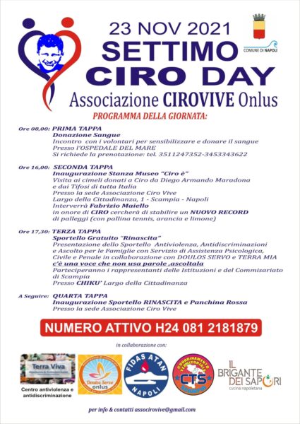 Il programma della giornata sarà: la mattina donazione del sangue in collaborazione con l’Associazione Fidas presso l’ospedale del Mare, nel pomeriggio verrà inaugurato lo sportello antiviolenza, antidiscriminazione, ascolto famiglie e la panchina Rossa in collaborazione con l’associazione Terra Viva. Fabrizio Maiello proverà un nuovo record di palleggi con pallina da tennis, arancia e limone nel nome di Ciro.