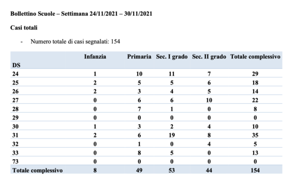 Nella scuola d’infanzia, degli 8 casi, 4 riguardano studenti, 3 docenti e uno un non docente. Nella scuola primaria invece dei 49 casi complessivi, 36 sono studenti, 12 docenti e 1 non docente. In quella di primo grado dei 53 casi totali, 48 sono studenti e 5 docenti. In quelle di secondo grado (44 totali), 43 sono studenti e uno non docente. Sono ben 847 il numero totale di contatti scolastici posti in quarantena (71 infanzia, 301 primaria, 201 primo grado, 274 secondo grado). 70 invece i contatti famigliari posti in quarantena.