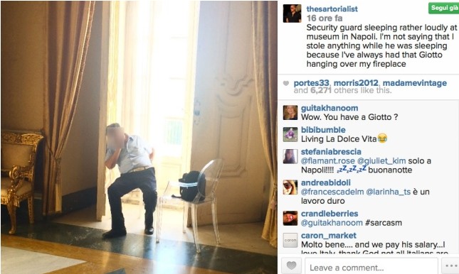 Un addetto alla sicurezza di un museo di Napoli che dorme. A testimoniare il fatto una foto di Scott Schuman, noto blogger conosciutissimo in rete con il suo The Sartorialist. Lo scatto ha subito fatto il giro del web e la sua diffusione sta diventando virale non solo in Italia ma anche nel resto del mondo.