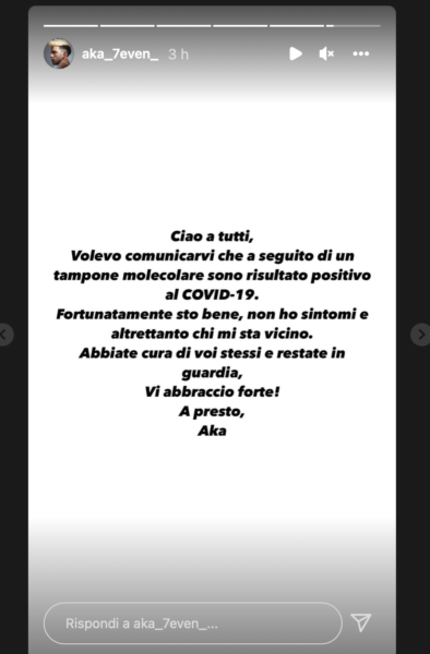 Aka7even, pseudonimo di Luca Marzano, è risultato positivo al covid. Il cantautore e rapper nato a Vico Equense ha informato i fan, attraverso una storia su Instagram, delle sue condizioni di salute.