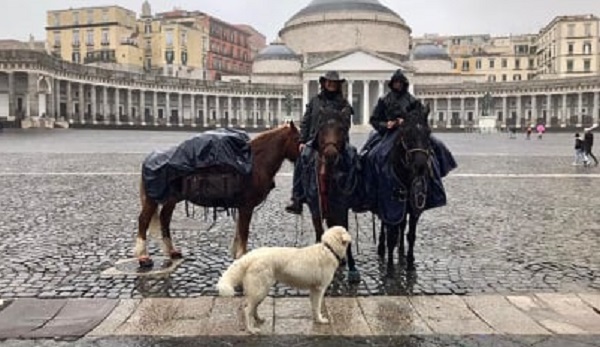 Nella foto che la ritrae a Piazza del Plebiscito insieme ai suoi amici a quattro zampe ha commentato: “Giro l’angolo, e mi ritrovo su questa bellissima piazza, fantastica Napoli!“.