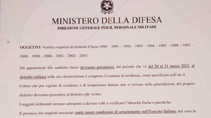 Appare come un documento del Ministero della Difesa, firmato dal sottocapo di Stato Maggiore Carmine Masiello, e riporta la convocazione di arruolamento per i nati dal 1990 al 2003. “Gli appartenenti alla suddetta classe dovranno presentarsi, nel periodo che va dal 20 al 31 marzo 2022, al distretto militare nella cui circoscrizione è compreso il Comune di residenza” – si legge.
