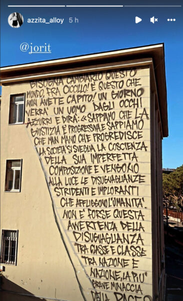 Entrambi i murales sono stati realizzati sulla facciata di edifici scolastici. Sono gli studenti infatti il futuro di questo paese. Il primo si trova a Salerno presso il Liceo “Sabatini Menna” e si chiama “Peace”. Presenta un occhio azzurro che piange, una colomba e la scritta pace. Come spiegato in un comunicato dalla Regione Campania, domani ci sarà l’inaugurazione: