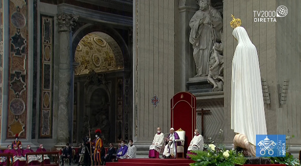 Noi, dunque, Madre di Dio e nostra, solennemente affidiamo e consacriamo al tuo Cuore immacolato noi stessi, la Chiesa e l’umanità intera, in modo speciale la Russia e l’Ucraina. Accogli questo nostro atto che compiamo con fiducia e amore, fa’ che cessi la guerra, provvedi al mondo la pace. Il sì scaturito dal tuo Cuore aprì le porte della storia al Principe della pace; confidiamo che ancora, per mezzo del tuo Cuore, la pace verrà. A te dunque consacriamo l’avvenire dell’intera famiglia umana, le necessità e le attese dei popoli, le angosce e le speranze del mondo.
