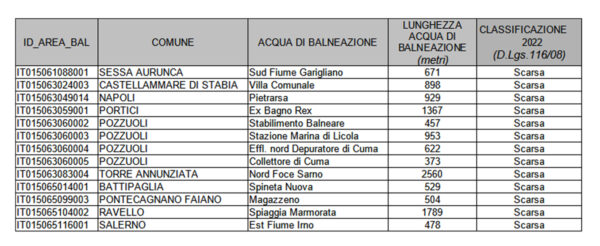 può essere revocato anche in corso di stagione balneare se si verificano le condizioni di legge che ne attestino il risanamento (decreto legislativo 116/08 e decreto ministeriale 30 marzo 2010). Sono interdetti alla balneazione, in quanto classificati di qualità “scarsa”, 13 tratti di costa compresi nei comuni di Sessa Aurunca, Pozzuoli, Napoli, Portici, Torre Annunziata, Castellammare, Ravello, Salerno, Pontecagnano Faiano e Battipaglia elencati in una tabella.