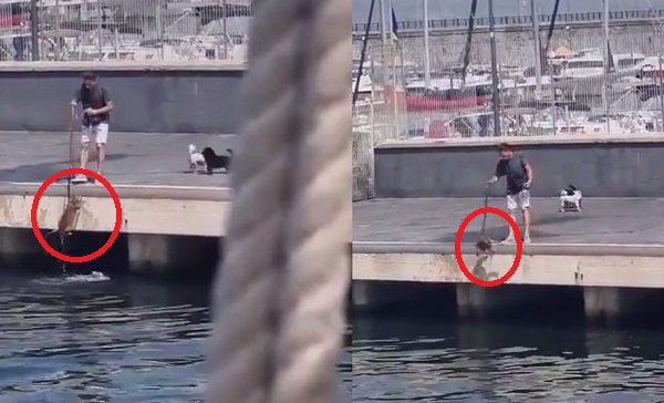 Nelle immagini si vede un giovane mentre passeggia sulla banchina di un porto, molti utenti nei commenti dicono sia quello di Torre del Greco, che per rinfrescare il suo cane decide di buttarlo in acqua. Il povero esserino si ritrova contro la sua volontà ad essere gettato in mare appeso al guinzaglio dal padrone che poi ad un certo punto decide che quella frescura può bastargli e lo tira fuori come fosse un “panaro“.