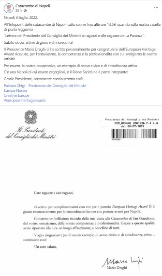“Cari ragazzi e ragazze, vi scrivo per complimentarmi con voi per il premio European Heritage Award. E’ il giusto riconoscimento per lo straordinario lavoro che portate avanti per Napoli. Conservo un bellissimo ricordo della mia visita alle Catacombe di San Gaudioso, del vostro entusiasmo, della vostra competenza e professionalità. Grazie a queste qualità avete riportato alla luce un luogo affascinante, a beneficio di tutti. Voglio ringraziarvi per il vostro esempio di senso civico e di cittadinanza attiva” – questo il contenuto della lettera inviata dal Premier ai ragazzi de La Paranza