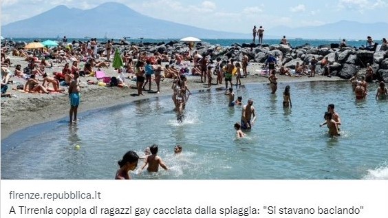 L’articolo riporta la notizia dei due ragazzi omosessuali che sarebbero stati mandati via dalla spiaggia in cui si trovavano per un semplice bacio. Un vero e proprio episodio di omofobia che si sarebbe consumato a Tirrenia, in provincia di Pisa, e non a Napoli come indica l’immagine inserita all’interno dell’articolo, con il Vesuvio in bella vista.