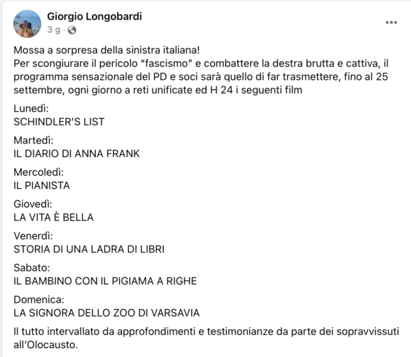 Longobardi ha infatti utilizzato un elenco di film per criticare l’operato della concorrenza in un post pubblicato il 13 agosto e spiegare la loro strategia politica attraverso la tv: