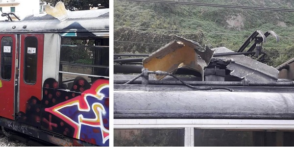 “È accaduto che il treno delle 7:12 da Sorrento per Napoli – continua – si è praticamente scoperchiato nella stazione di Castellammare di Stabia. Dalla dirigenza daranno sicuramente colpa alla vecchiaia dei treni, ai rami degli alberi vicini alla linea ferroviaria o magari anche agli alieni…(dimenticando che la legge gli consente e gli impone di tagliare i rami indipendentemente dalla proprietà degli alberi stessi, DPR. 753/1980, ma nulla prevede per gli alieni)”.