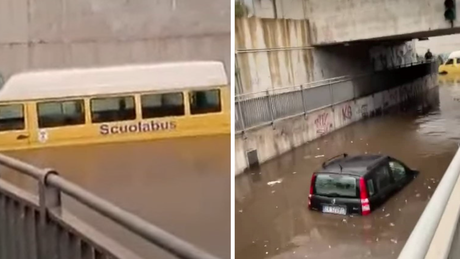 Le immagini diffuse sul web mostrano strade invase da acqua che quasi sommergono le auto in transito. Il sottopasso che raggiunge le vie parallele alla Litoranea risulta del tutto allagato e, nelle vicinanze, si vede uno scuolabus risulta coperto per metà dall’acqua.