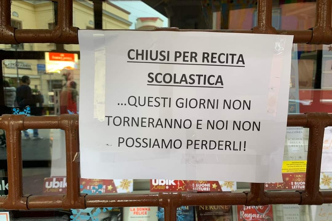 Negozio napoletano chiuso per recita scolastica. È l’avviso della libreria Ubik di Vico Equense esposto fuori alla serranda per avvertire i potenziali clienti. Il messaggio scritto su un foglio A4 continua cosi: “questi giorni non torneranno e non vogliamo perderli”.