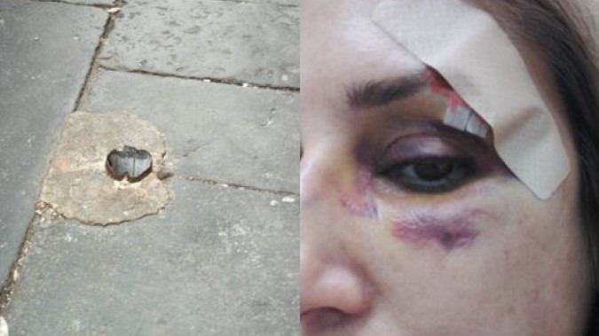 Alla denuncia si accompagnano due foto: una del marciapiede con tanto di residuo di paletto, l’altra della vittima con una grave ferita all’altezza del sopracciglio e vari ematomi sul viso.