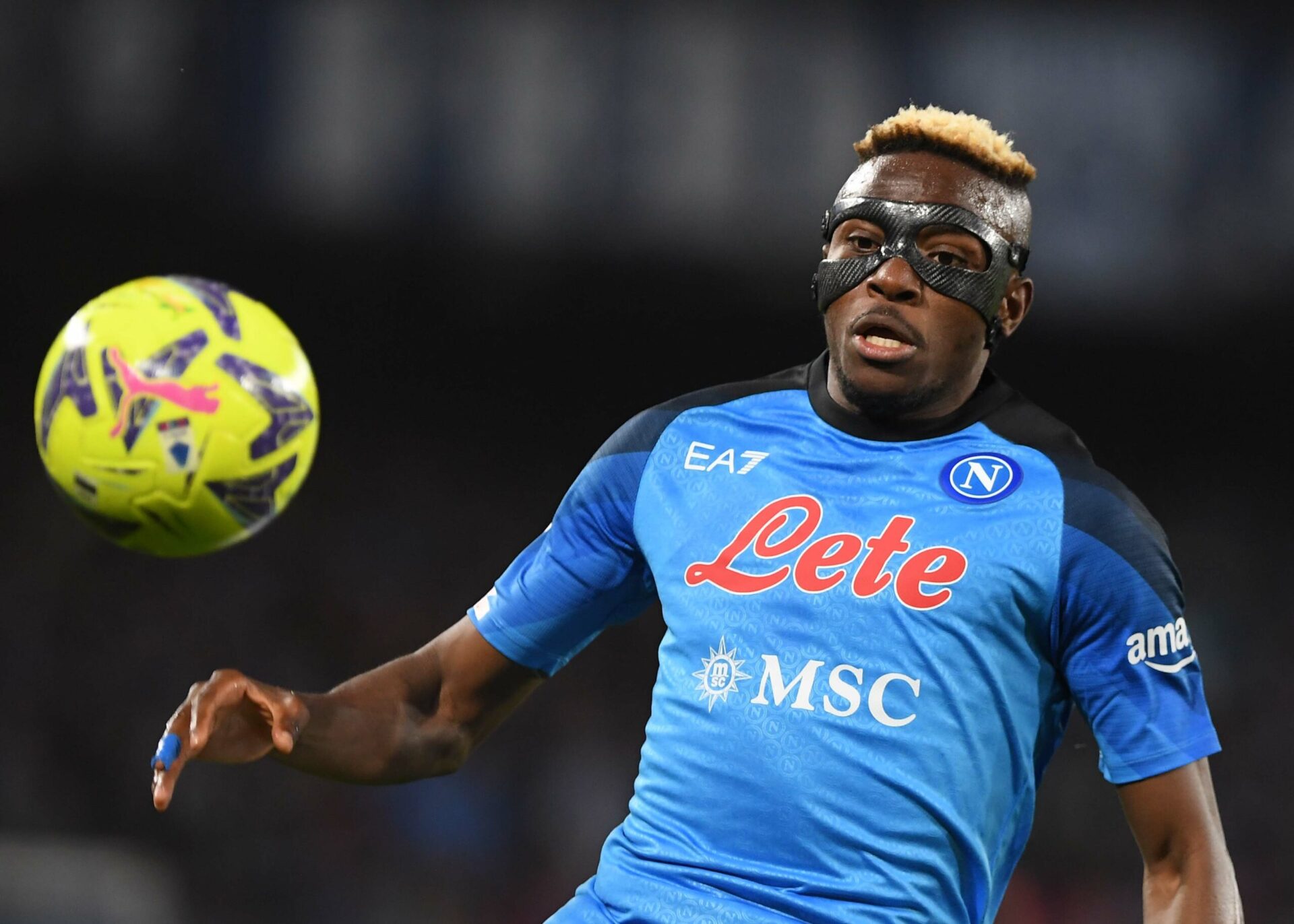 Victor Osimhen in azione con indosso la maschera protettiva che ha smarrito in Africa