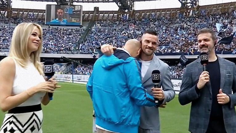 Si mette le mani davanti al viso, si scusa perché non riesce a parlare mentre Cristian Maggio lo attira a sé e abbracciandolo sussurra: “Ecco cosa vuol dire essere napoletano”. Ed è proprio vero, perché il suo stato d’animo è quello dell’intero popolo partenopeo, felice e commosso per quel traguardo che si appresta a diventare realtà.