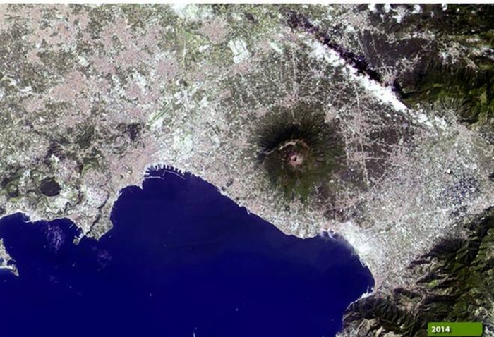 In questo caso i satelliti Landstat 5 e 8 hanno fotografato il golfo di Napoli, coprendo un’area di circa 180 chilometri. La comparazione delle due immagini, scattate entrambe il 18 settembre ma una nel 1985 e l’altra nel 2014, fanno emergere uno sviluppo urbanistico dell’area tra Torre Annunziata e l’agro nocerino, facendo scomparire numerosi campi coltivabili ed appezzamenti di terreno che ne caratterizzavano il territorio. L’unica zona verde che ancora sopravvive è quella intorno al Vesuvio, costellato di abitazioni in zona a rischio di eruzione.