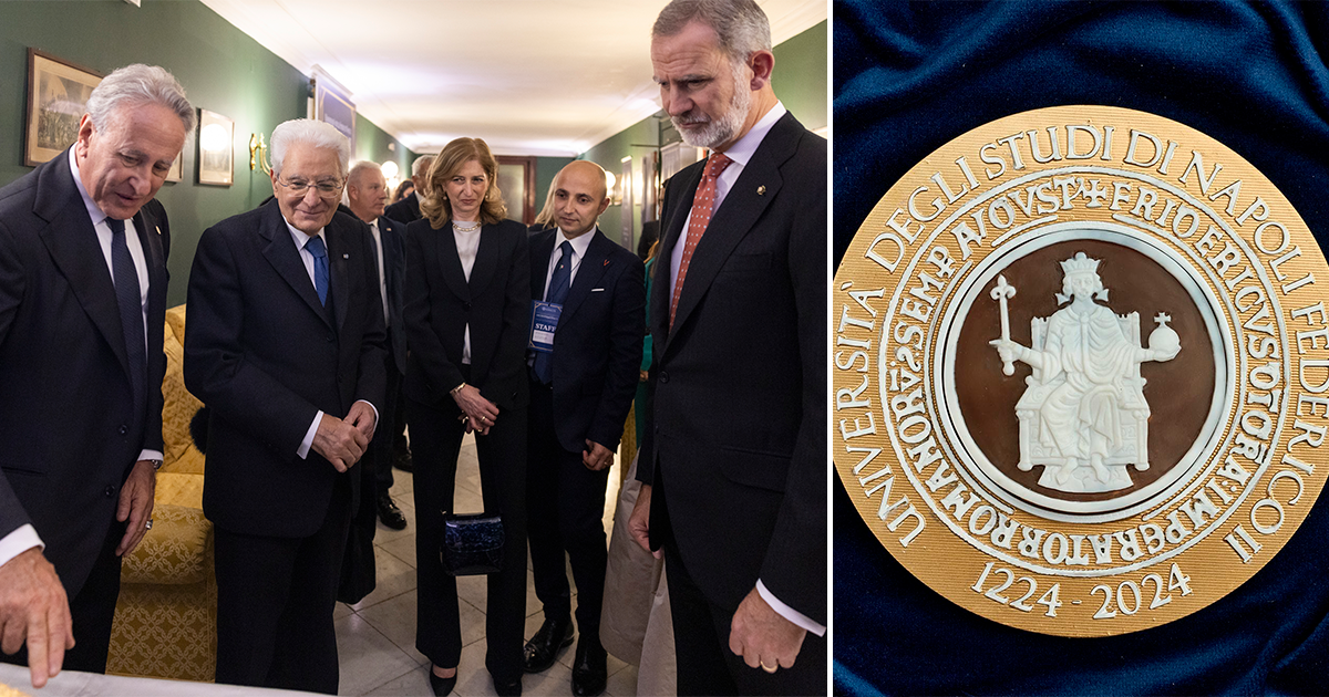 Prima dell’evento, il prof. Matteo Lorito, rettore dello storico ateneo che quest’anno festeggia gli 800 anni dalla fondazione, ha donato due opere al Re di Spagna Felipe VI e al Presidente Mattarella, realizzate da Aucella, storica azienda di Torre del Greco.