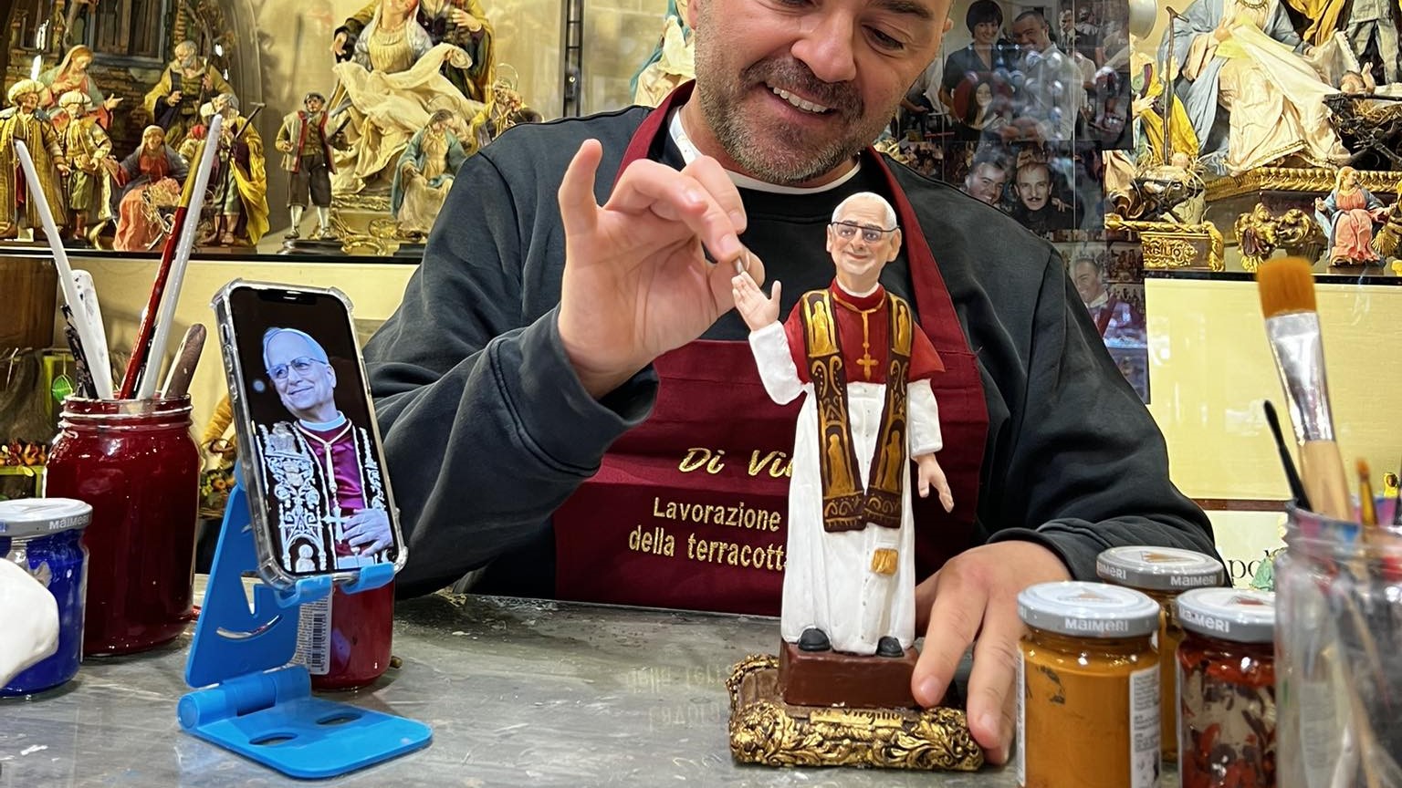 “Ho lavorato tutta la notte sulla statuina basandomi su una delle foto scattate ieri dove il Papa, l’americano, sorride e saluta i fedeli” – ha svelato l’artista, intervistato dall’Ansa poco dopo aver presentato il suo nuovo lavoro.