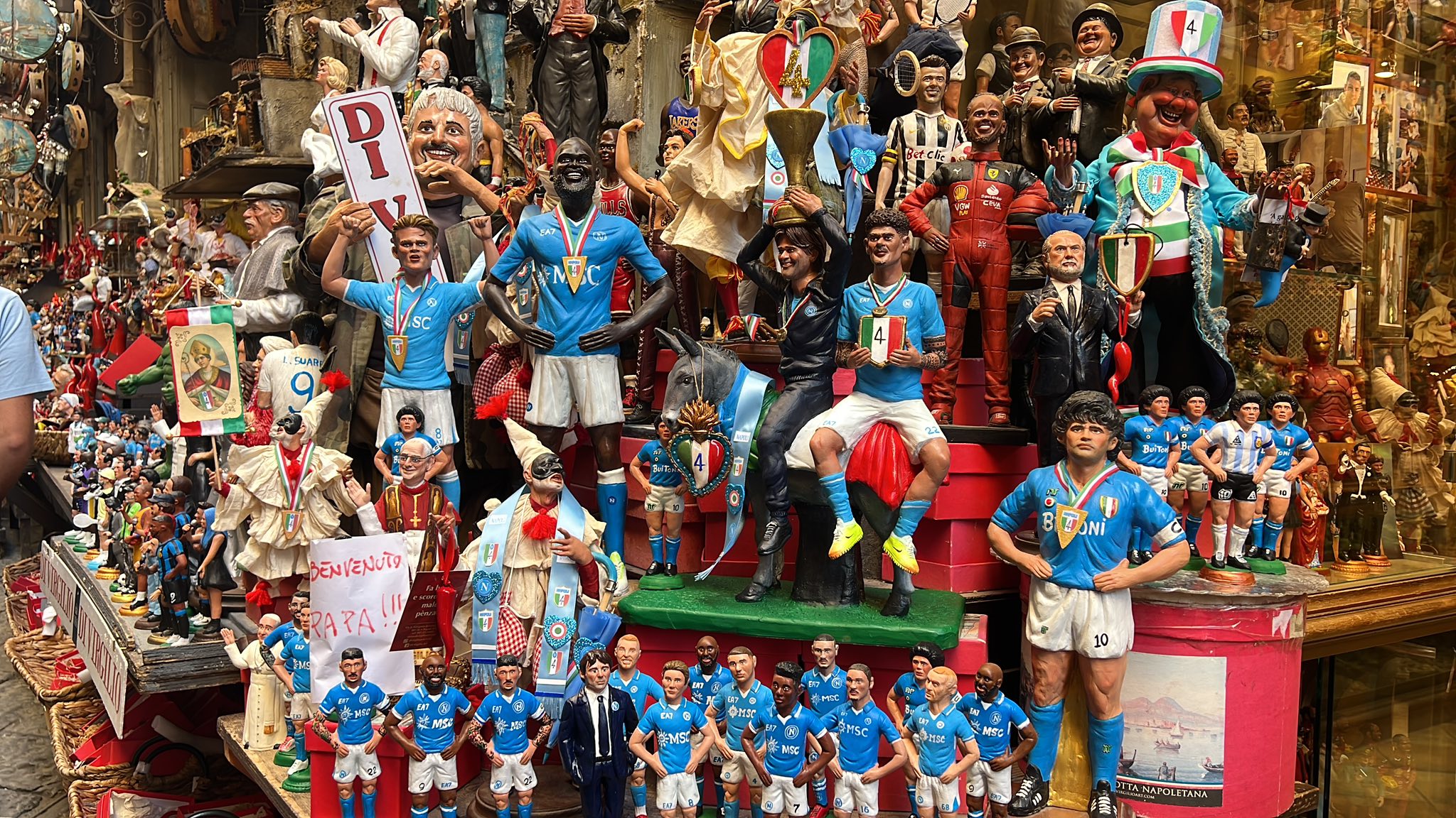 A poche ore dalla vittoria dello scudetto da parte del Napoli, anche il presepe napoletano si è tinto di azzurro: è l’omaggio che il maestro presepiale Genny Di Virgilio ha dedicato alla squadra partenopea, tra calciatori, allenatore e presidente esposti all’esterno della sua celebre bottega di San Gregorio Armeno.