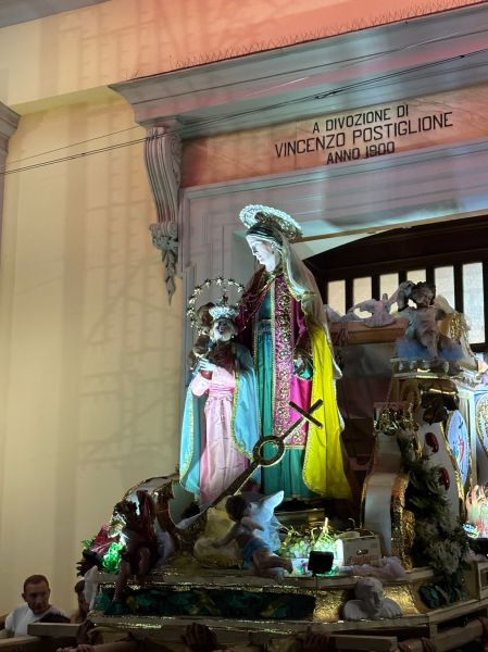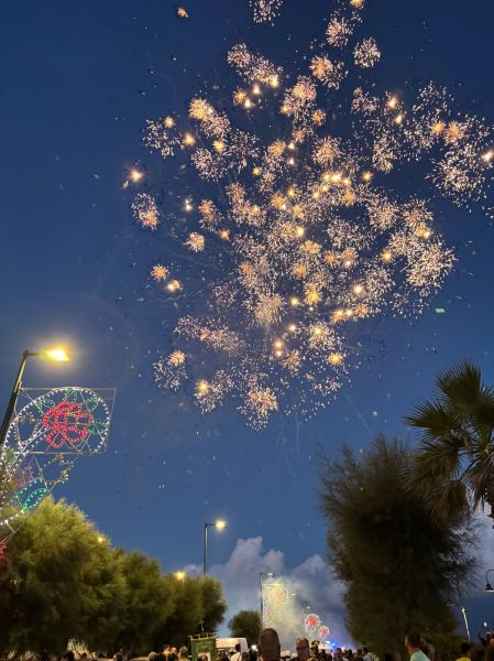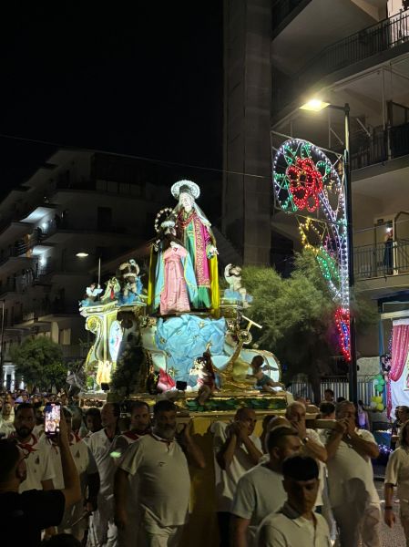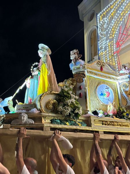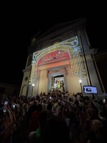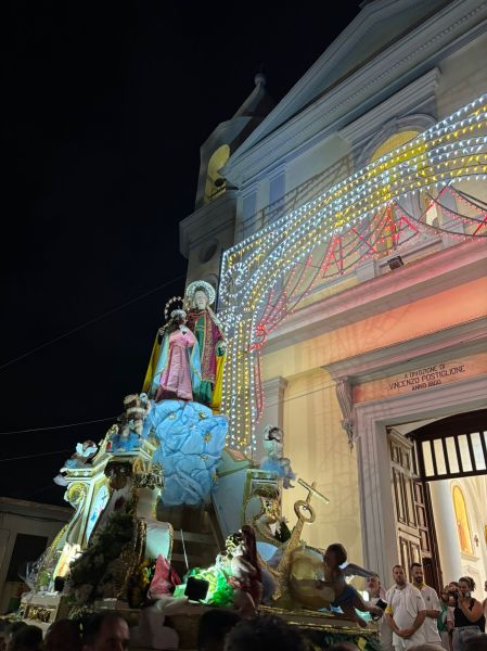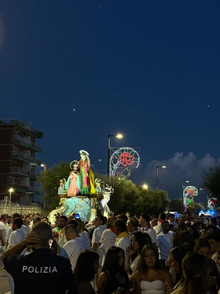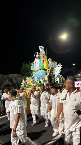 Intanto il meteo ha graziato la serata di domenica, rinfrescando (leggermente) ma non impedendo la grande processione che vede le statue di Sant’Anna e della Vergine Maria portate in trionfo per le vie della contrada: da via Mortelle a viale Europa, da via Litoranea a S.Maria la Bruna, il percorso della patrona è un susseguirsi di omaggi floreali, pirotecnici, ringraziamenti, preghiere ed affidamenti, sotto la guida spirituale di don Lorenzo Pernice.