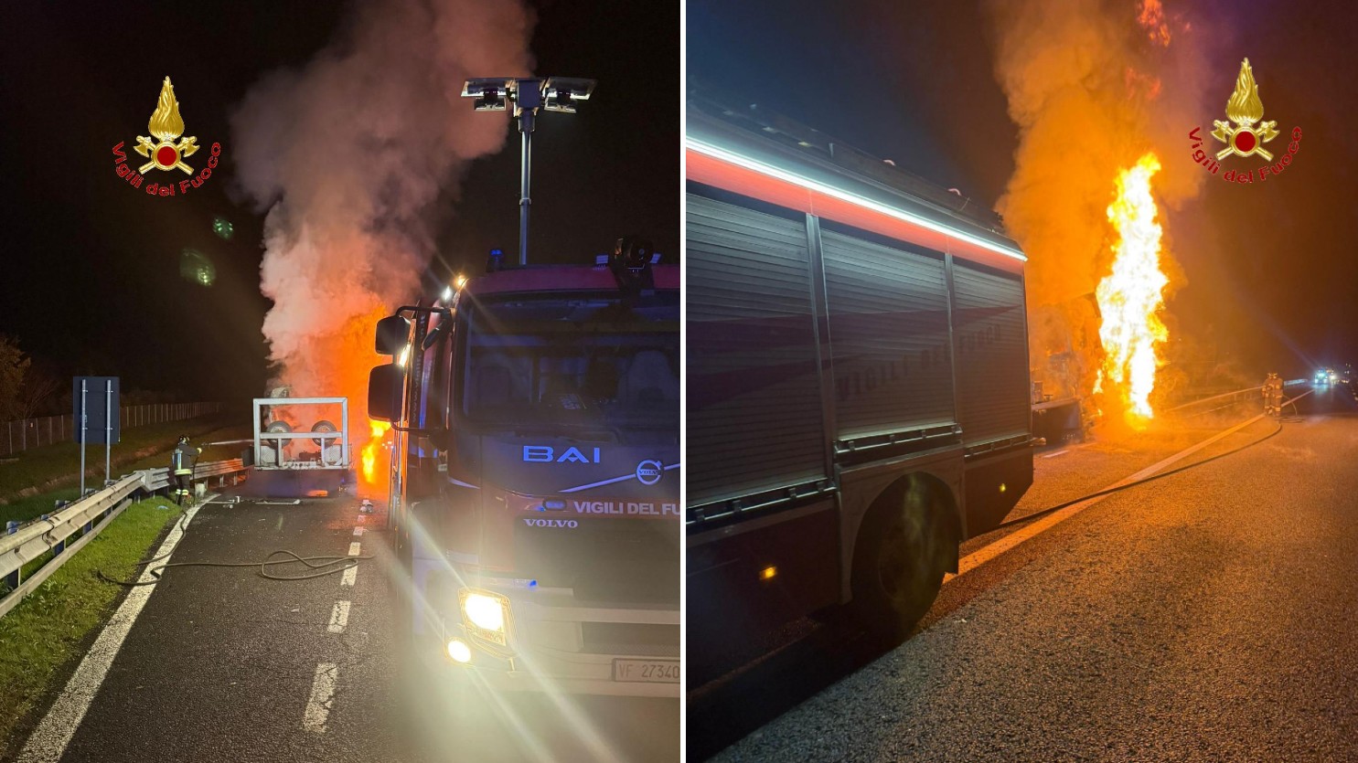 All’arrivo della squadra, il mezzo pesante era completamente avvolto dalle fiamme e l’incendio aveva già raggiunto una delle motrici caricate sul rimorchio. L’autoarticolato si trovava fermo sulla corsia di emergenza.