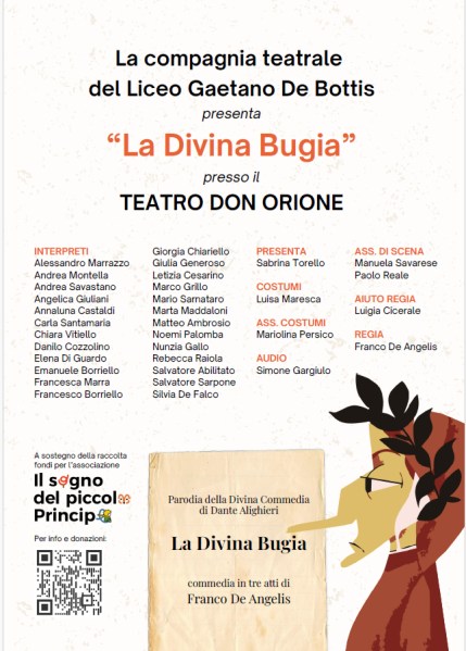 “La Divina Bugia” è il risultato di un lavoro condiviso che ha coinvolto studenti, docenti, organizzatori e volontari in un’unica direzione: costruire un momento di unione reale, in cui palco e platea diventano parte dello stesso progetto solidale. Partecipare significa esserci, fermarsi, ascoltare, lasciarsi attraversare dalle emozioni.