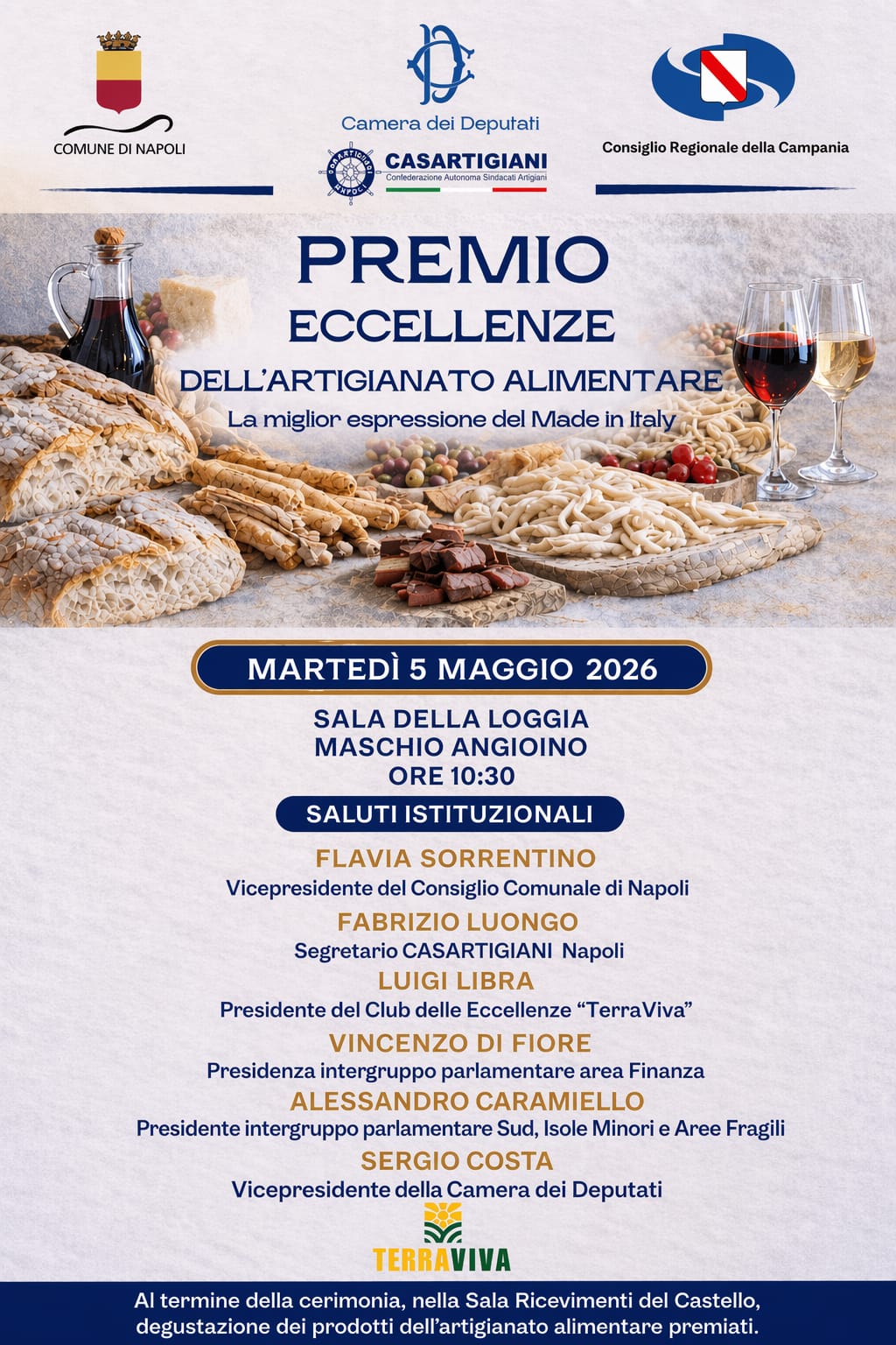 Al termine della cerimonia, nella Sala Ricevimenti del Castello, sarà possibile degustare le eccellenze delle imprese premiate: un viaggio sensoriale tra i sapori autentici della Campania, garanzia di salute, qualità e rispetto per le radici.