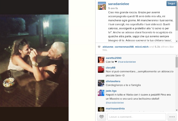 Ciao mia grande roccia. Grazie per avermi accompagnato questi 18 anni della mia vita, mi mancherai ogni giorno. Mi mancheranno i tuoi sorrisi, i tuoi consigli, ma soprattutto i tuoi abbracci. Quelli calorosi, avvolgenti e protettivi alla “ci sono io per te”. Anche se adesso starai facendo lo scugnizzo da qualche altra parte, sappi che qui avremo sempre bisogno di te. Adesso suonerai la tua chitarra lassu’, e farai sognare gli angeli con la tua musica, esattamente come hai fatto con noi qua. Fai buon viaggio…Ti amo.