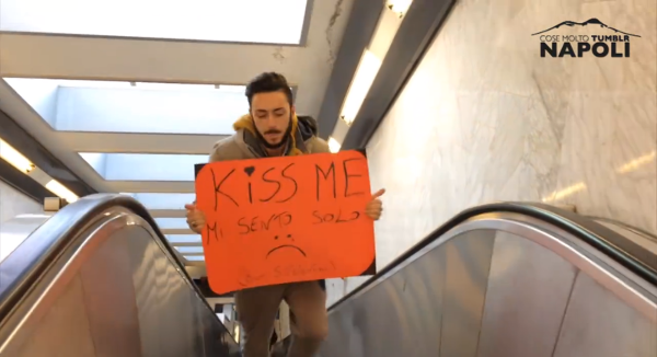 Nuovo divertente esperimento sociale per le strade di Napoli, stavolta a tema “bacio”: si tratta di “Kiss me – Mi sento solo”, ideato da Cose Molto Tumblr – Napoli, dove il protagonista, un ragazzo, fermo in strada, al Vomero e in Via Toledo, esibisce un cartello rosso che riporta la scritta a penna “Kiss me, mi sento solo” ed una faccina triste. Prontamente, sia ragazze che ragazzi si fermano per dargli un bacio sulla guancia. Le reazioni dei passanti sono tra le più svariate… C’è chi si ferma solo per curiosare, chi interrompe il proprio lavoro per baciare il ragazzo, in segno d’affetto e chi si ferma e lo bacia senza pensarci un attimo. Ciò conferma ancora una volta che i napoletani sono un popolo davvero affettuoso! E non negano una carezza nemmeno agli sconosciuti!