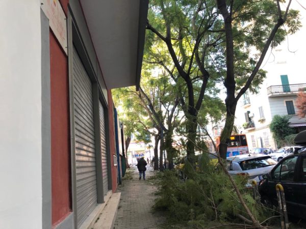 Forte il rischio di caduta di alberi e cornicioni. E in città sono tanti i rami che con la pioggia e il vento sono venuti giù. Questa è la situazione al Vomero, fuori allo Stadio Collana. La struttura sarà inaugurata martedì ma lo scenario al suo ingresso vede rami e un tronco di un albero bloccare l’accesso.