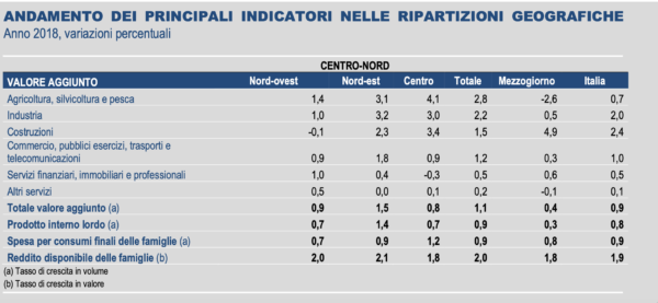 Il Pil misura il valore aggregato, a prezzi di mercato, di tutti i beni e i servizi finali (cioè destinati al consumo) prodotti sul territorio di un Paese in un dato periodo di tempo. Se a livello nazionale i dati Istat 2018 rilevano un Pil aumentato dello 0,8% rispetto all’anno precedente, fa riflettere la differenza tra Nord e Sud. Con il Nord, in particolare l’area Nord-est a registrare una crescita di Pil importante dell’1,4%, trainato dalla performance dell’Industria (+3,2% rispetto al 2017) e dai risultati positivi delle Costruzioni (+2,3%) e dell’Agricoltura (+3,1%).